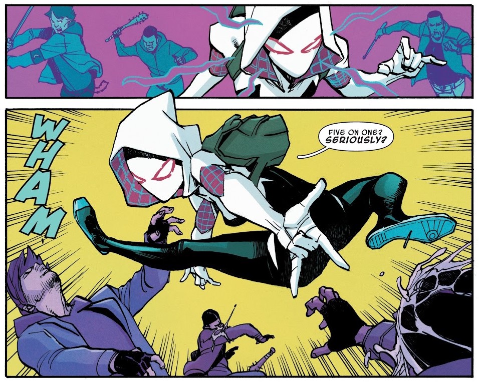 In the early 2010s, I was given a collection called Spider-Man Loves Mary Jane, a retelling of Spider-Man’s early days from Mary Jane Watson’s point of view. I was unfamiliar with the book, which was then almost ten years old. Spider-Man’s heroics played only a peripheral role, the focus being the social lives of Mary Jane and her friends. Takeshi Miyazawa’s wonderful manga-influenced art captured the teenage experience in a way I’d never before seen. The facial expression and body language of that age are there with all the dramatic glory that they entail – the emotion in his work is visceral and affecting. More recently, Miyazawa worked on Ghost-Spider, a more traditional superhero book, albeit one with a young female lead – an alternate-universe Gwen Stacy being the one who gets bitten by a radioactive spider. In this context, Miyazawa shows his aptitude with action sequences, which he didn’t get much opportunity to do in SMLMJ. He does so with aplomb; he can effectively produce more than teen drama, although that is present – Gwen is college-aged, but still a teenager. Miyazawa also displays his versatility by changing the drawing style a bit from that in SMLMJ – though the work is still unmistakably his – it is more adult, appropriate for the tone of the book.