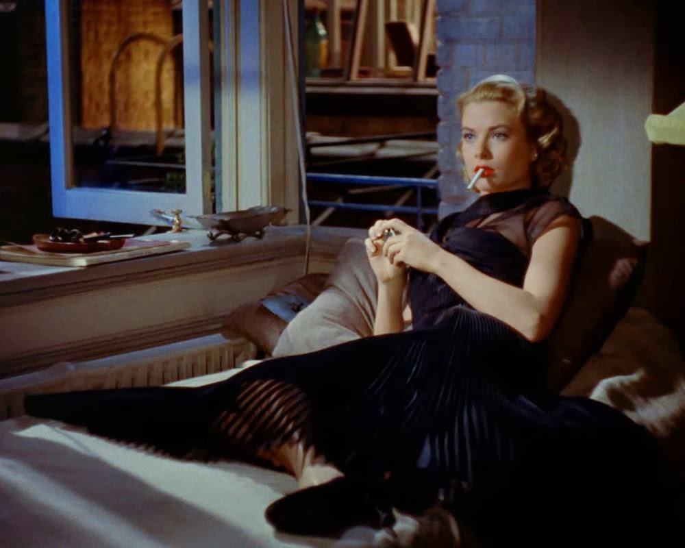 Rear Window still: Lisa Carol Fremont (Grace Kelly) in front of the titular window.