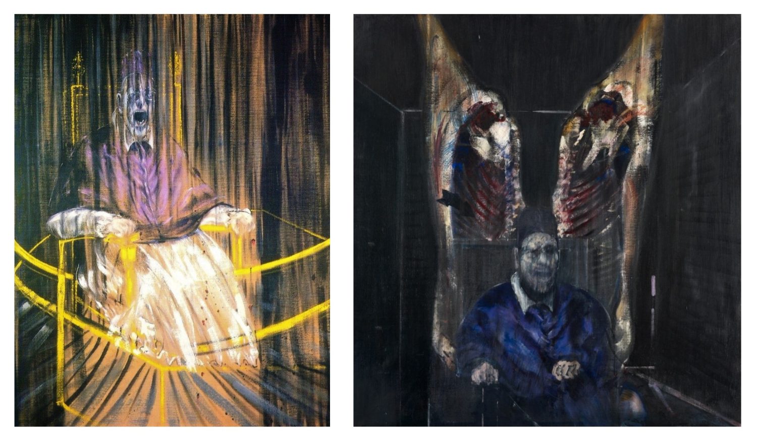 The papal portraits are often referred to as Bacon’s “screaming popes,” although many of them aren’t screaming. Some seem stoic, some look anxious or agitated, at least two appear to be laughing. Study after Velázquez’s figure, however, is definitely screaming, and quite vehemently, with his hands desperately clenched as if he’s shackled in an electric chair. From the late 1940s through the mid/late 1950s, Bacon often utilized vertical striations, which he called “shuttering,” to merge figure and ground in his work. The shuttering employed in Study after Velázquez is his most emphatic use of it of which I am aware – while in other paintings it often appears like folds in a lace curtain, here it looks more like bars of a cage running through the figure. It is the most bold and intense of the papal portraits, of which there exist roughly fifty. Both Study after Velázquez’s Portrait of Pope Innocent X and Figure with Meat are more subtly evocative, but in terms of immediate, authoritative impact, Study after Velázquez is the apex of the pope paintings.