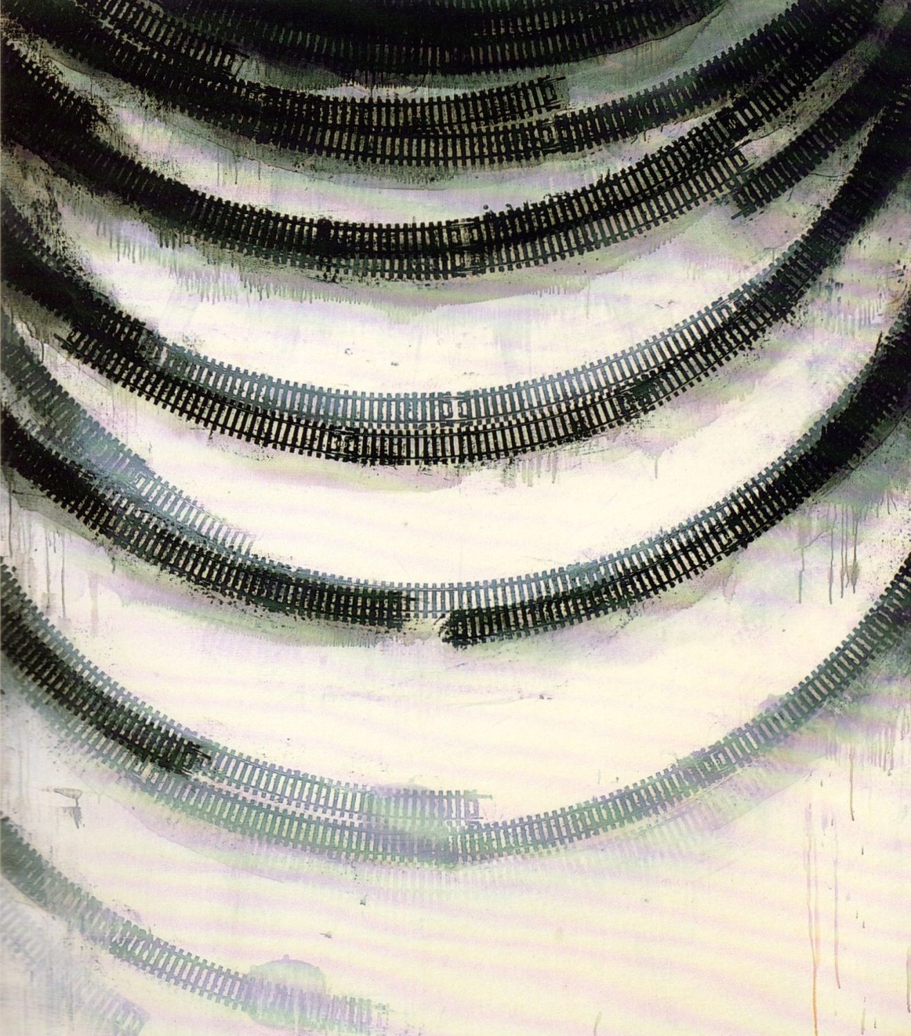 Back in 1997, when Oropallo was still producing paintings that were oil on canvas, she had a solo show titled Flat Pictures at the Stephen Wirtz Gallery in San Francisco. The paintings were executed chiefly with silkscreens, which she had utilized before, but to my knowledge, never to such an extent. My favorite paintings in this particular show were of railroad tracks. There were several, some of which employ color; I prefer the black and white ones, which have a Franz Kline-esque quality to them. I seem to remember reading at the time the images were based on photos of pieces from her child’s toy train set, and that there were also actual tracks running past her studio in an industrial area of Berkeley, CA – Oropallo often makes reference to her personal environment in her work.